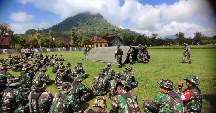 TULUNGAGUNG - Pelaksanaan hari kedua Latihan Lapangan Kodim 0807 Tulungagung di Lapangan Desa Tanggulwelahan, Kecamatan Besuki, Kabupaten Tulungagung para pelaku latihan menerima berbagai materi teknis penting sebagai bekal personel dalam menghadapi situasi darurat dan bencana di lapangan, Selasa (14/10/2025).